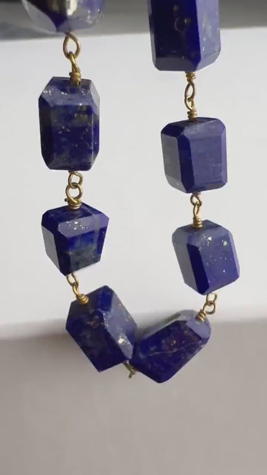 Genuine Lapis Lazuli Free Form Raw Faceted Rectangular 9-12mm Pillars Wire Wrapped gold Necklace mag ball Clasp,chakra healing gift