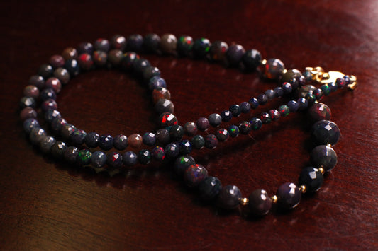 Natural Black Ethiopian Welo Fire Opal Faceted Round 3-7mm Graduated Necklace. 14K Gold Filled Necklace
