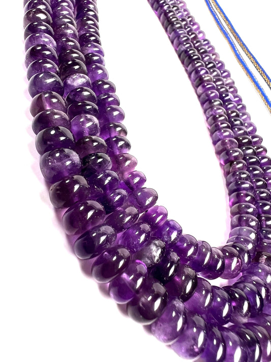 Natural Amethyst Purple Smooth Roundel 7-8mm large 3 line necklace, 18.5” long plus 10”adjustable thread. Healing chakra gemstone