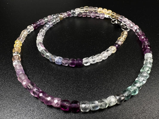 Natural Rainbow Fluorite square Cube Faceted beaded Sterling Silver Necklace,Choker Layering,Prom, Graduation June Birthstone, Precious Gift