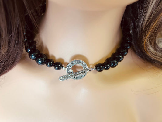 Genuine Black Onyx 14mm Large Smooth Round Bali Style Toggle Necklace, elegant gift