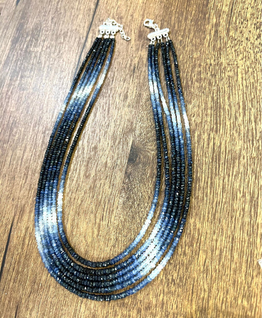 6 line Ombre Sapphire Graduated 2.5-3.5mm Faceted Roundel Necklace. 17”-19” natural sapphire Beads Necklace with silver Adjustable Clasp