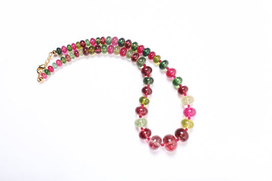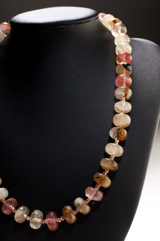 Natural Rock Crystal Graduated Necklace, Multi Color Crystal Quartz 8-17mm Rondell with Faceted Pink Spinel Accent Spacer Beads 19" Necklace