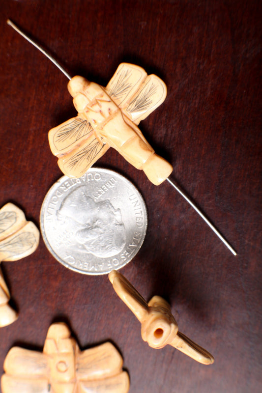 Carved Buffalo Bone Hand Carved Dragonfly, 30mm Double Sided, Drilled Bead Pendant, Art Deco