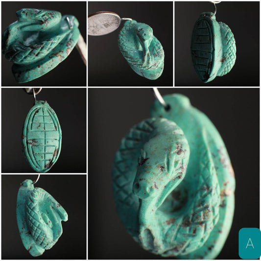 Natural Turquoise Hand Crafted Snake Pendant, Top Drilled, Miniature Animals Collectible Figurines Vintage Sculpture, Old Stock