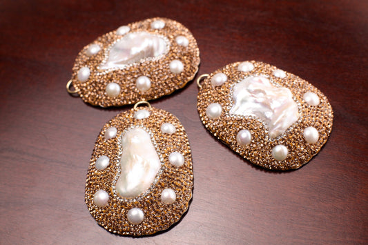 Freshwater Biwa Pearl Pendant, Inlaid Rhinestone Crystal Handmade Fancy Focal Bead, 42x58mm, 1 pc, Jewelry Making Bling Bead