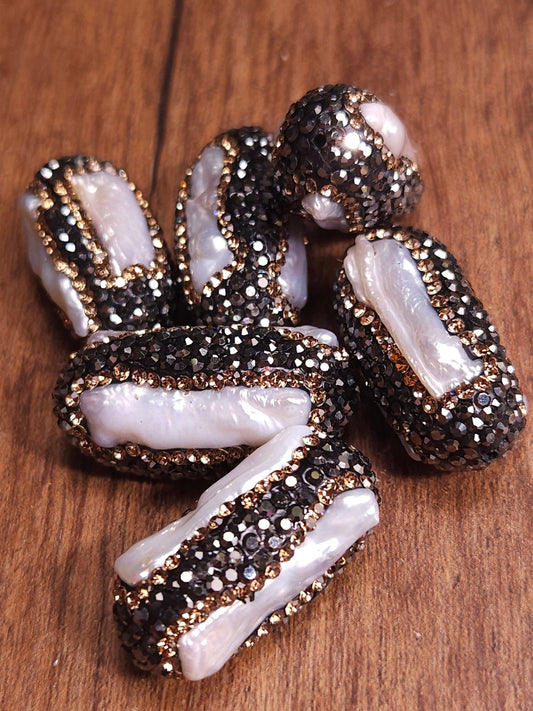 Freshwater Biwa Pearl 3 sided, 30mm Inlaid Black, Gold Rhinestone Crystal Handmade Fancy Focal Bead, 1 pc, Jewelry Making Bling Bead
