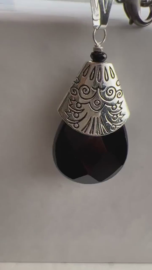 Black Spinel Diamond Cut Necklace with Oxidized Silver Teardrop, Large Bali Style Cap, Black Onyx Pear Drop Pendant Necklace