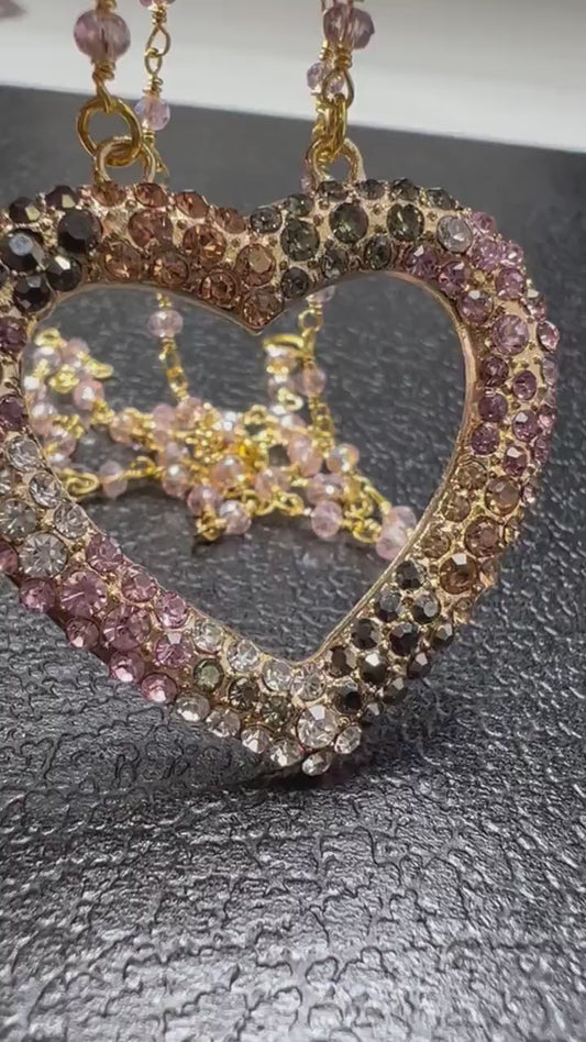 Cubic Zirconia CZ Diamond Style 39mm Heart Pendant, Gold Pink Crystal Wire Wrapped chain Necklace, valentines Gift for her