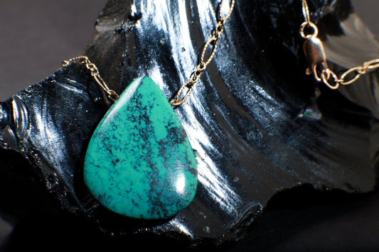 Genuine Tibetan Spiderweb Turquoise Double Sided Teardrop Pendant in 14K Gold Filled Corrugated Chain 20" Gift For Her