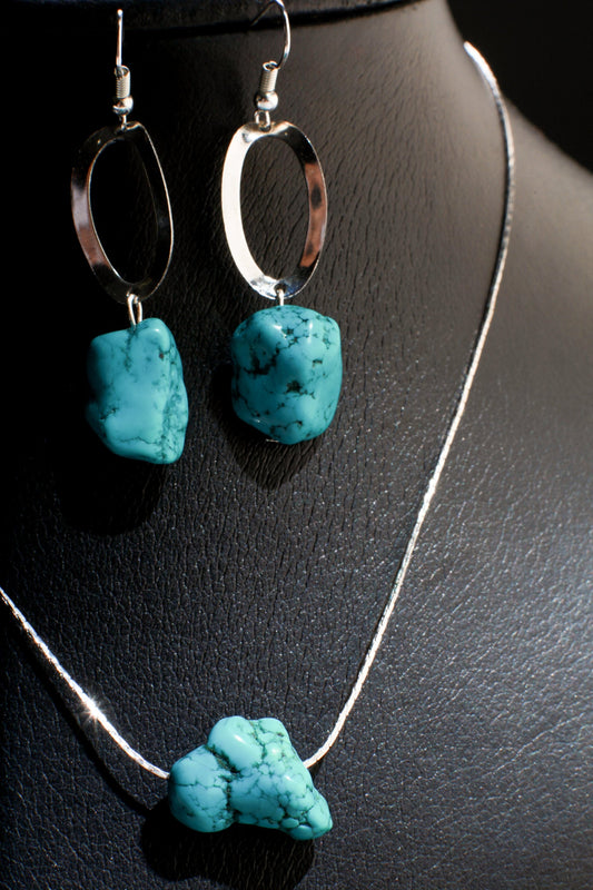 Natural Raw Turquoise Nugget Earring and Necklace Set in 16" Silver Filled Beading Chain and Ear wire Jewelry Set with 2" Extension Chain