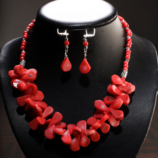 Genuine Bamboo Salmon Pink coral Pear drop, drum shape Bali style handmade necklace, Leverback earring set,17" + 4" extension, vintage gift