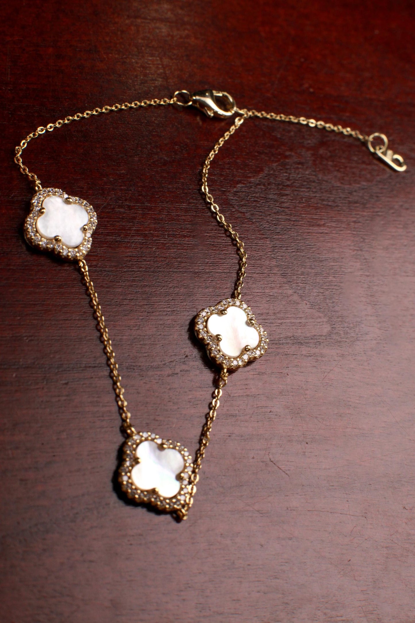 22k Gold Vermeil over 925 Sterling Silver Mother of Pearl 12mm Flower 3 pieces Charm with CZ Diamond setting around Bracelet. Adjustable 7”to 8.25" Gold Lobster Bracelet Love