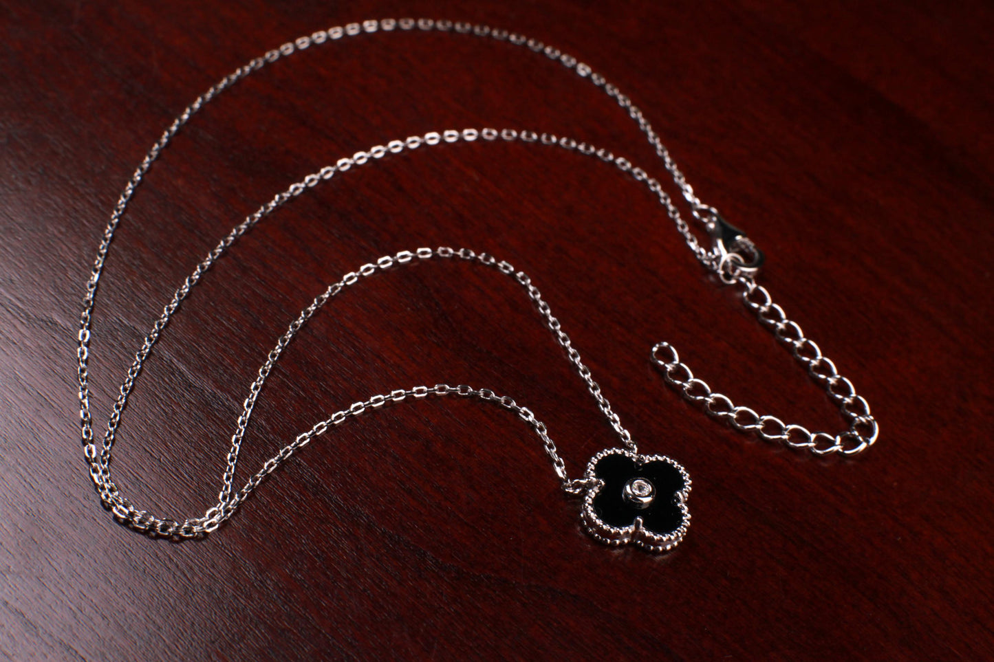 925 Sterling Silver Black Onyx Double Sided 16mm Four Leaf Flower Charm with CZ 16” plus 2” Extender Necklace, Love charm