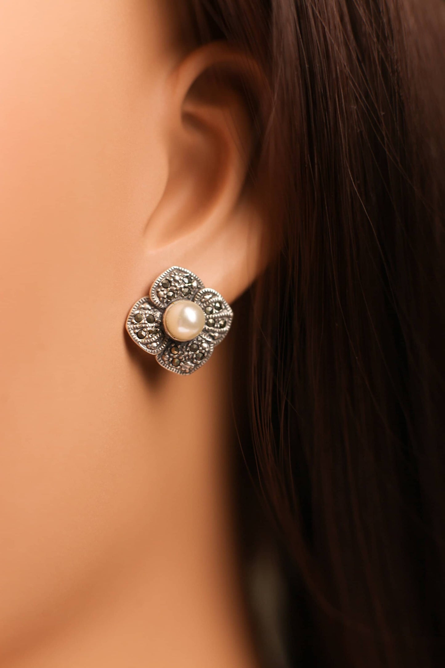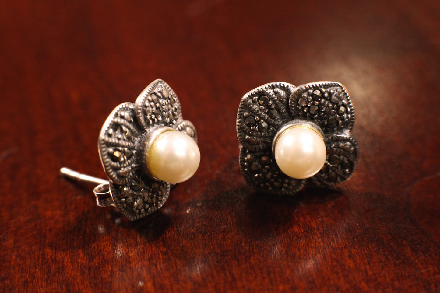 925 Sterling Silver Marcasite with Pearl 15mm Flower Post Earrings and Sterling Silver Box Chain 16" Necklace Jewelry Set