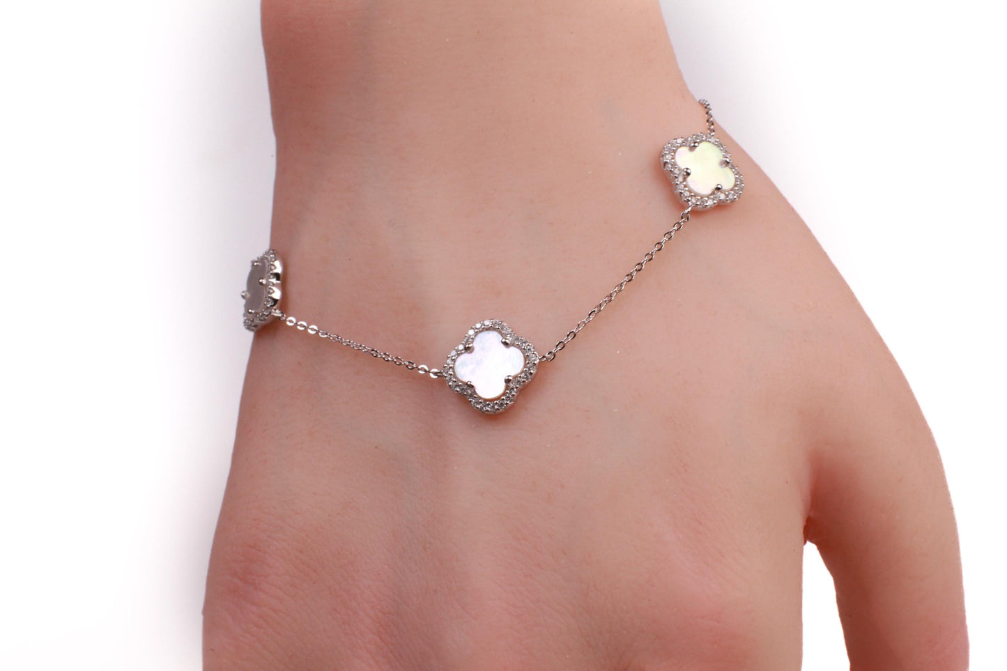 925 Sterling Silver White Mother of Pearl Four leaf Flower Charm CZ diamond setting Adjustable 7” to 8.25" Silver Bracelet, Love charm