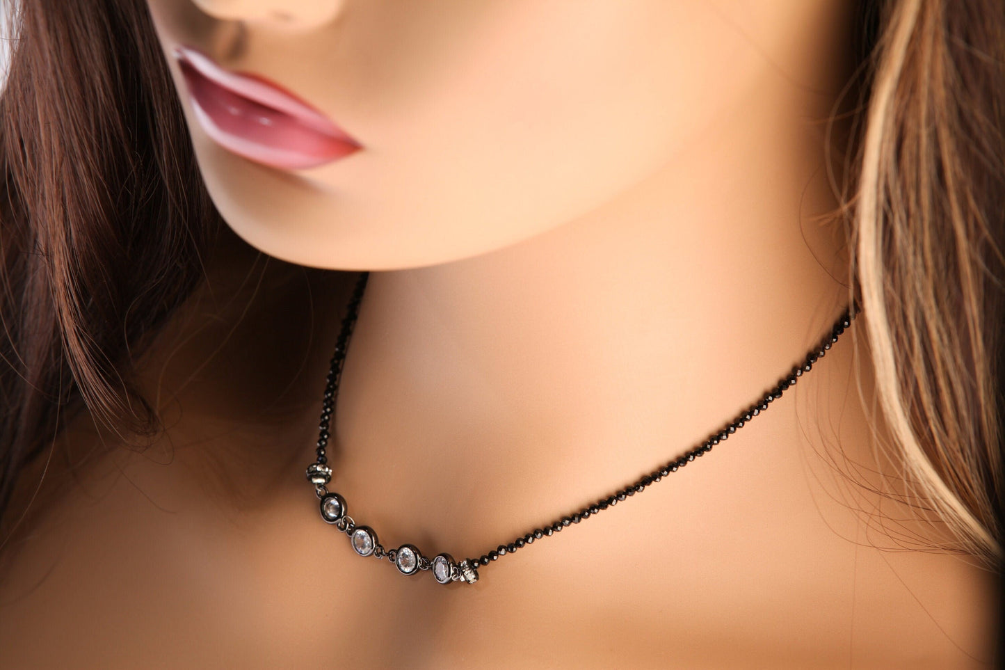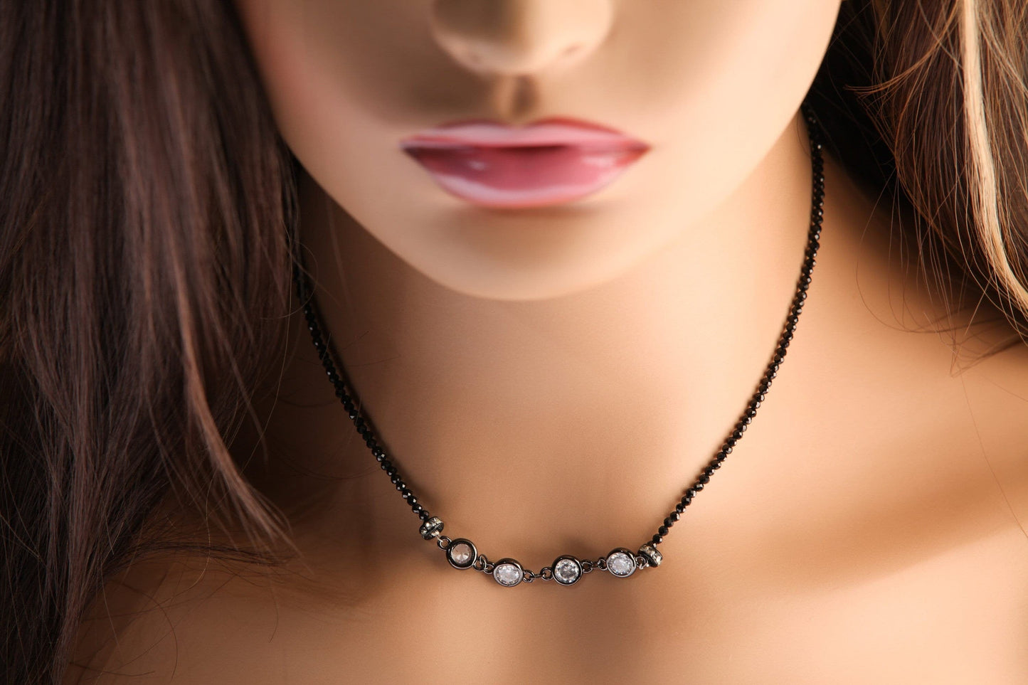 Black Spinel Diamond Cut Choker Necklace with 6.5mm Cubic Zirconia Disk and Rhinestone Spacers Necklace,