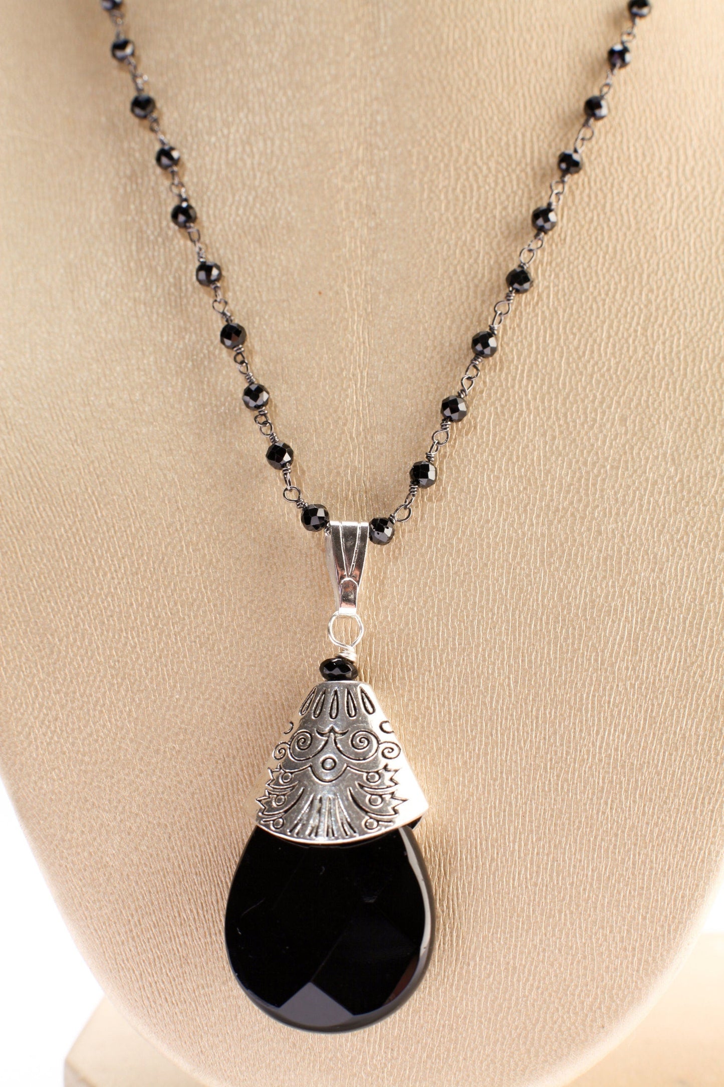 Black Spinel Diamond Cut Necklace with Oxidized Silver Teardrop, Large Bali Style Cap, Black Onyx Pear Drop Pendant Necklace