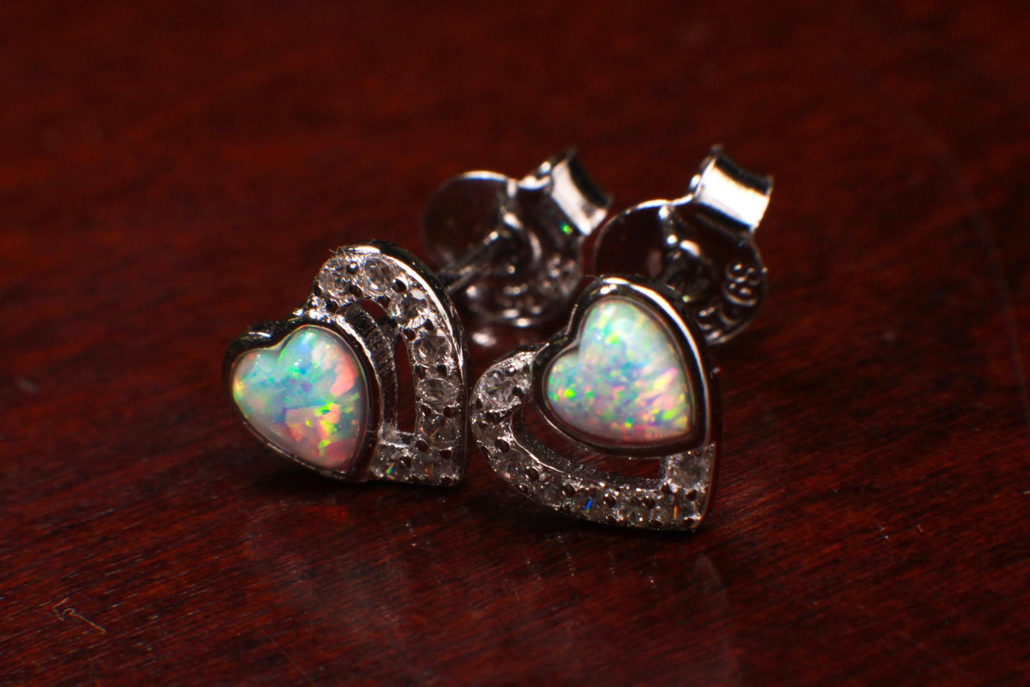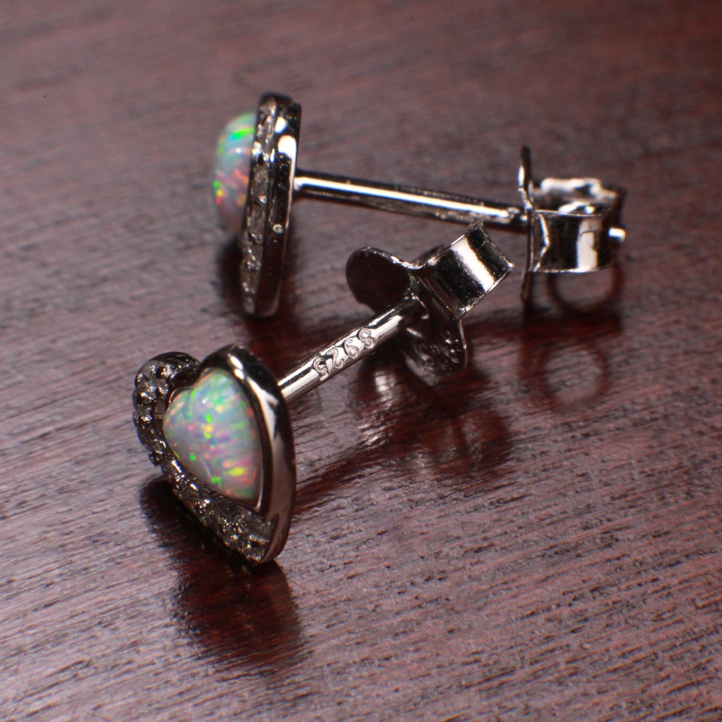 Ethiopian Fire Opal, Welo Opal, 7mm Double Heart CZ Diamond Stud Earrings 925 Sterling Silver AAA Fiery Opal Elegant Earring valentines gift