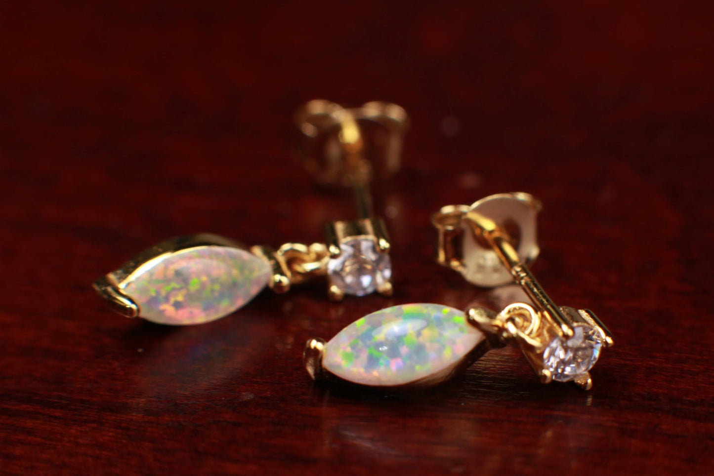 Ethiopian Fire Welo Opal, 4x9mm Marquise CZ Dangling Stud Earrings in Gold Vermeil, AAA Quality Fiery Dainty 925 marked Earrings