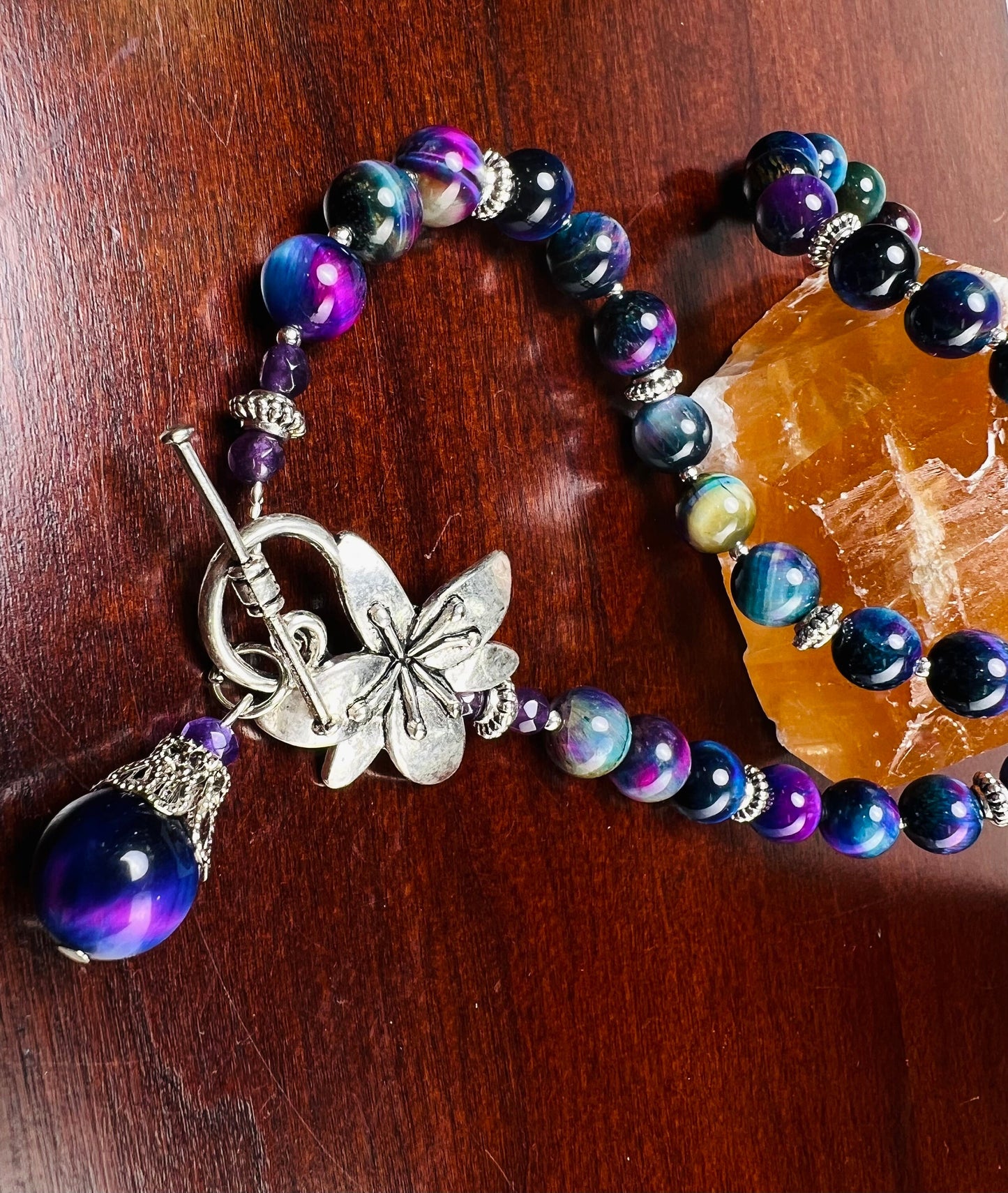 Galaxy Tiger Eye 8mm smooth round AAA quality with matching pendant Bali style spacer and flower toggle necklace. Strength