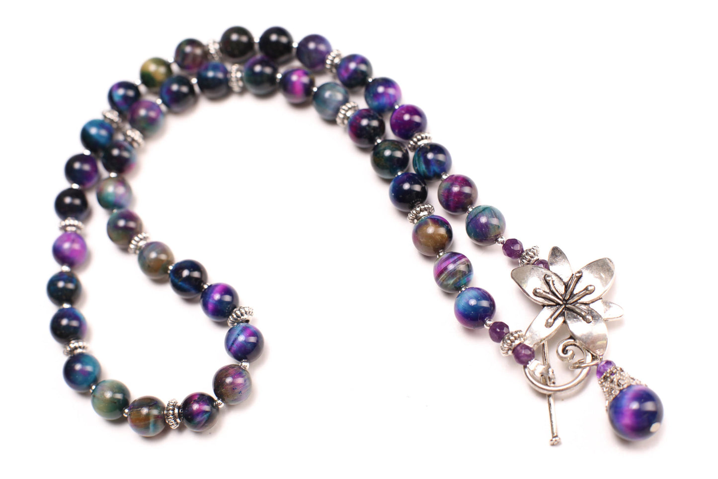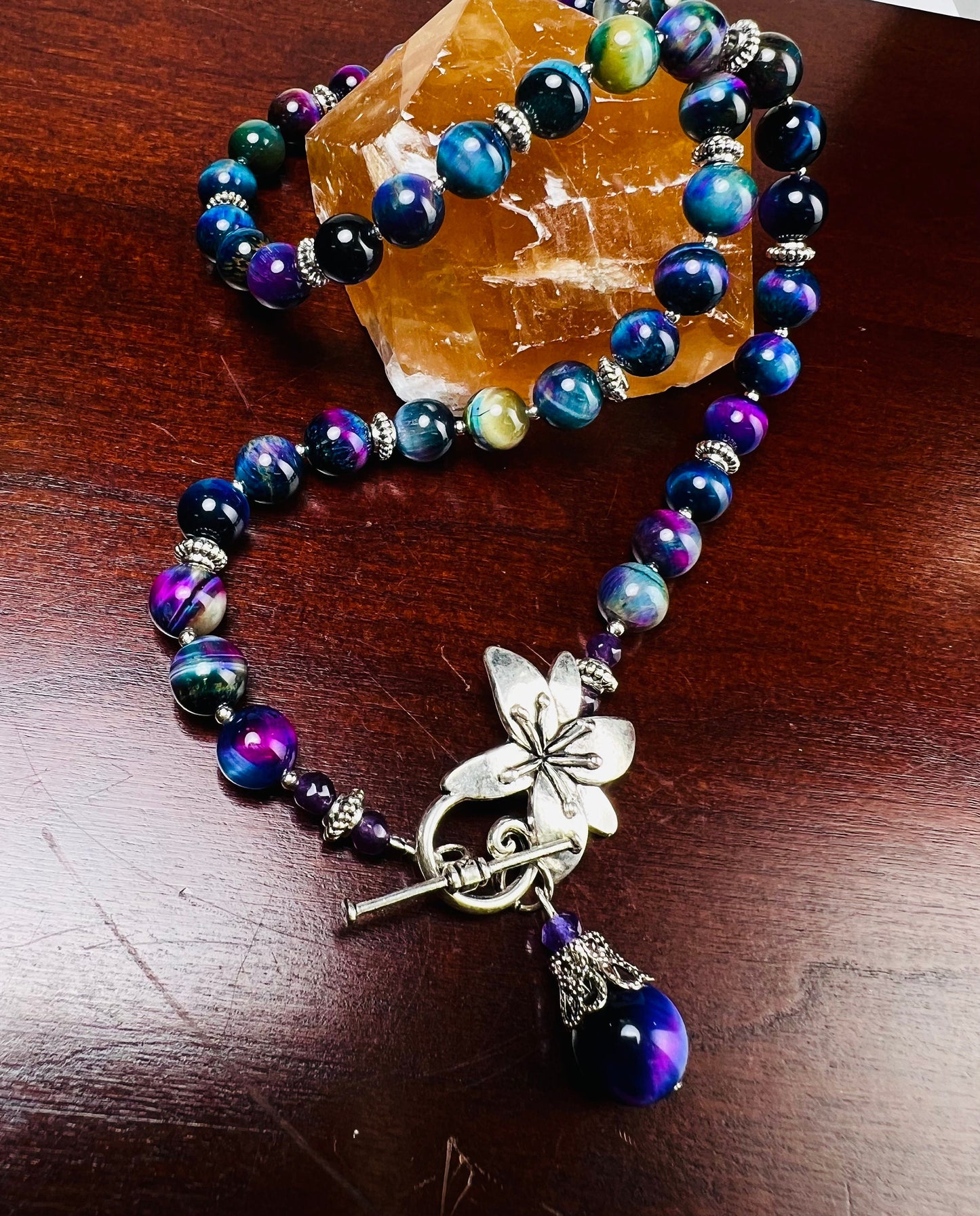 Beautiful blue purple brown greenish band natural Tiger gemstone Necklace. Strength prosperity gems