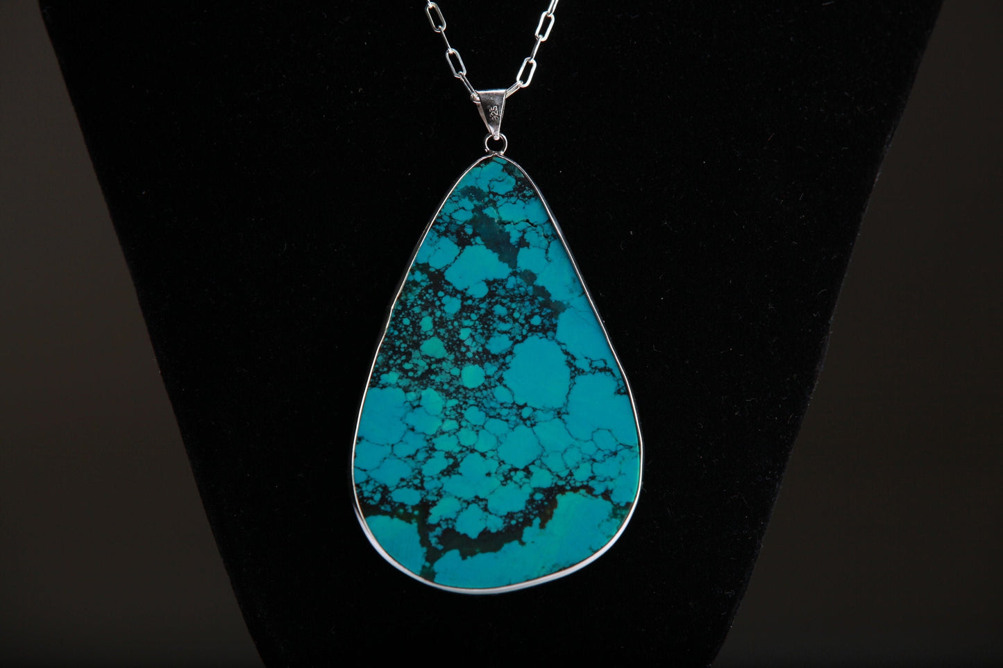 Genuine AAA Tibetan Spectacular Spiderweb Turquoise Cabochon Bezel Gemstone 925 Sterling Silver Pendant Vintage Jewelry--Optional 925 Sterling Silver Chain, 77x50mm 27g
