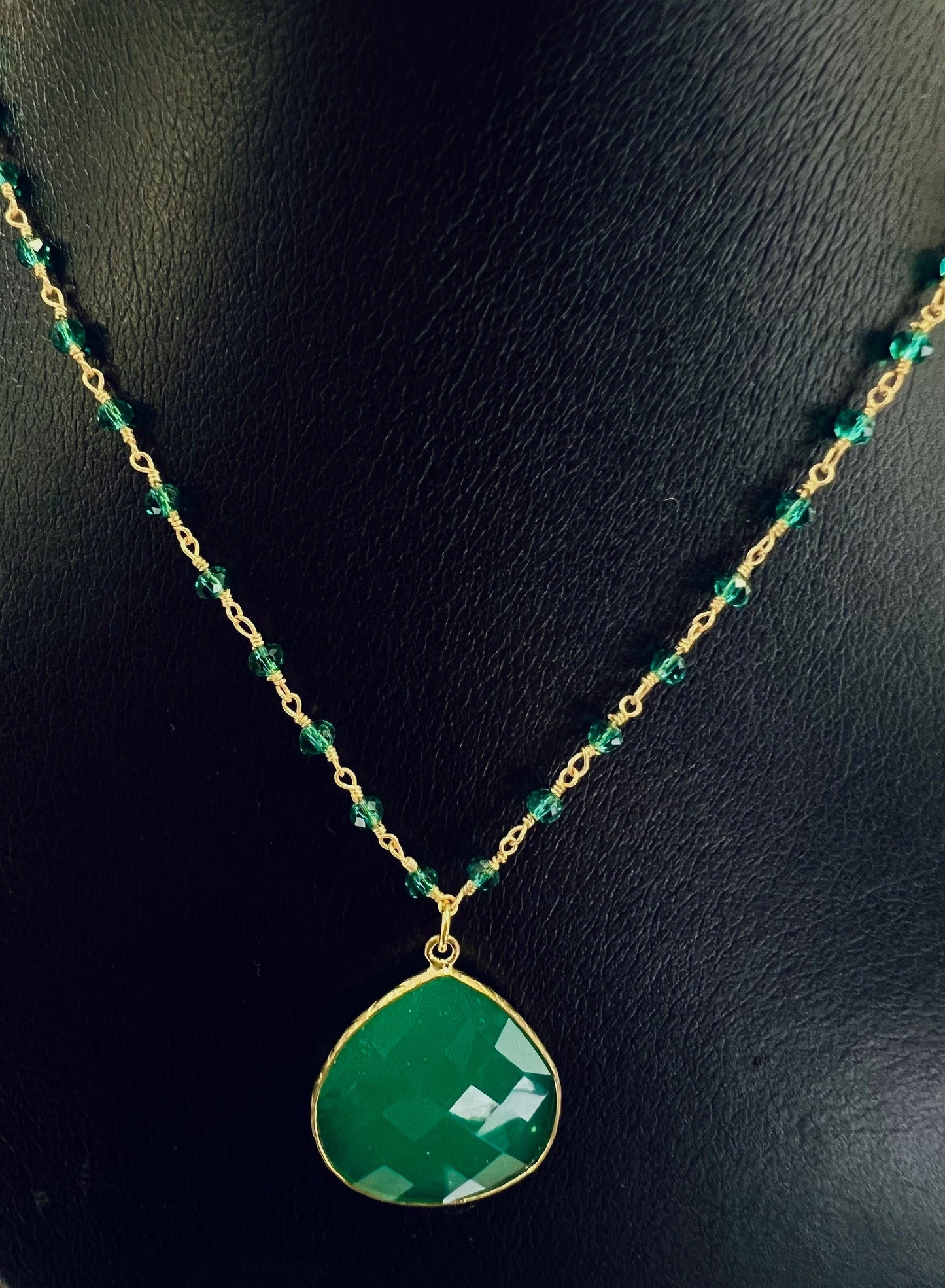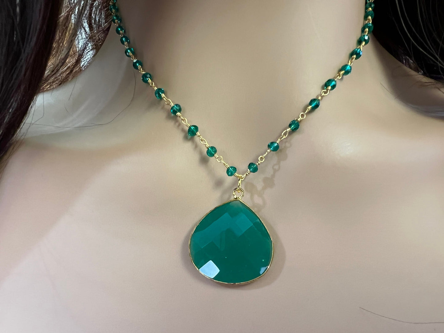 Genuine Green Onyx Bezel Teardrop Pendant with matching beaded wire wrapped rosary chain Necklace. Gift for her