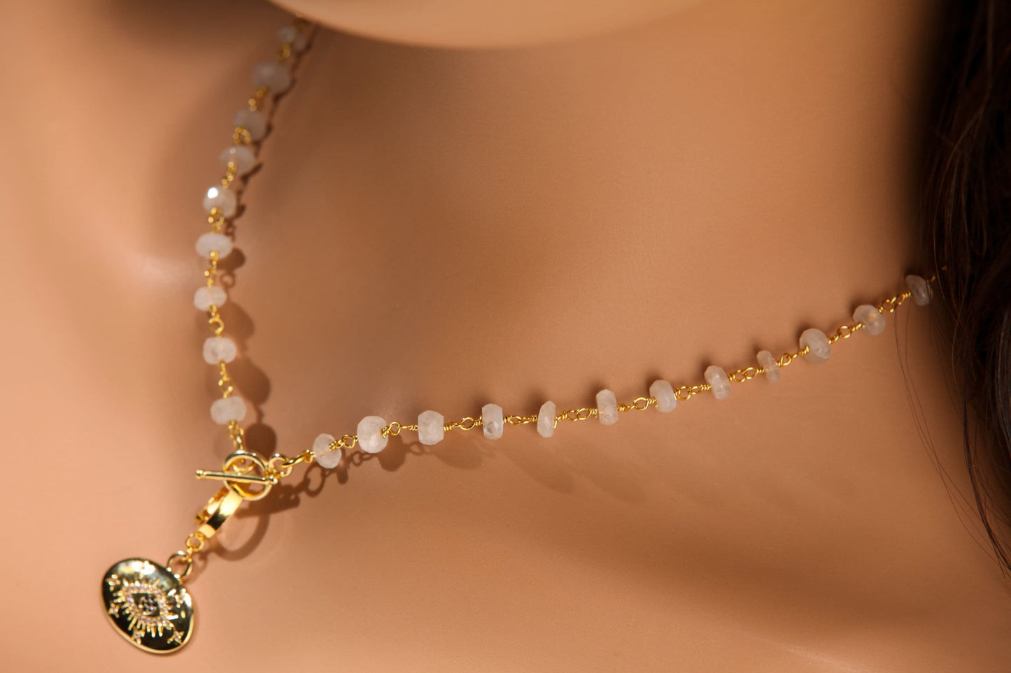Genuine Rainbow Moonstone Wire Wrap Rondelle Gold over Sterling Silver Chain, Layering, Choker, Toggle Necklace, Removable Evil Eye Pendant