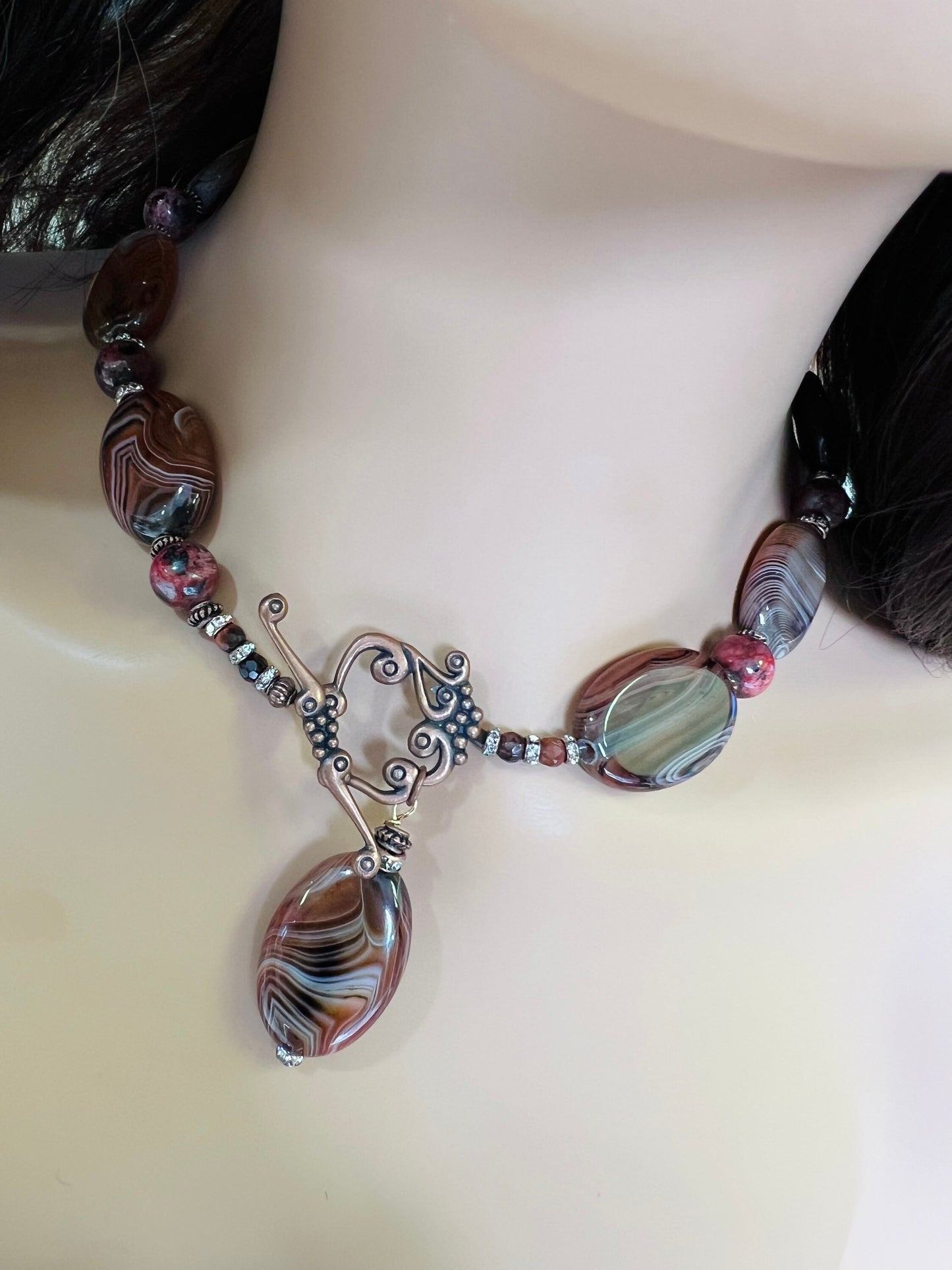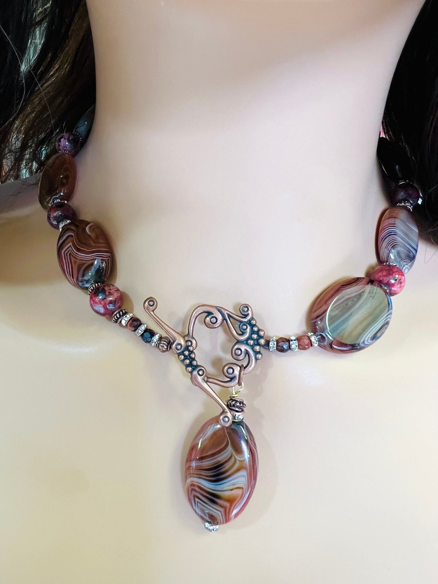 Genuine stripe agate smooth oval antique copper fancy toggle front and pendant statement chunky necklace 18”