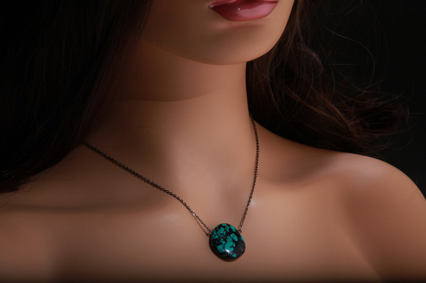 Genuine Tibetan Spiderweb Turquoise Double Sided Free Form Oval Pendant in Oxidized Sterling Silver Cable Chain 18.5" +2" Extension, Gift