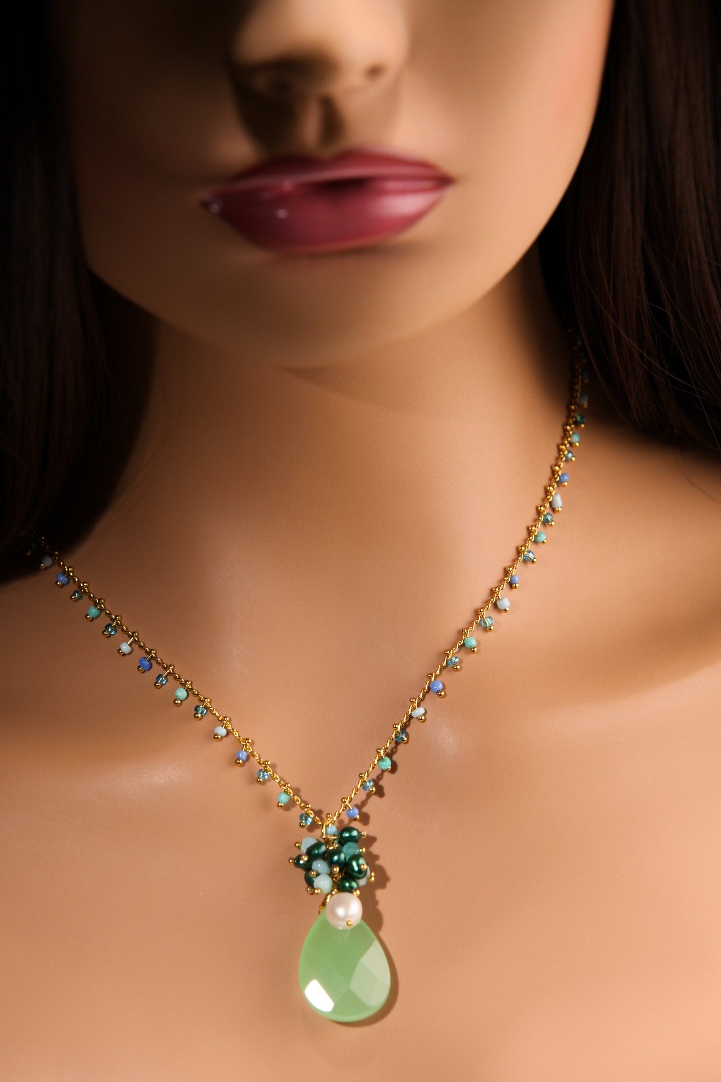 Green Chalcedony Pear Drop 16x25mm, Wire Wrapped 7mm Freshwater Pearl, Apatite, Amazonite, Green Pearl Clusters with Gold Rosary Chain