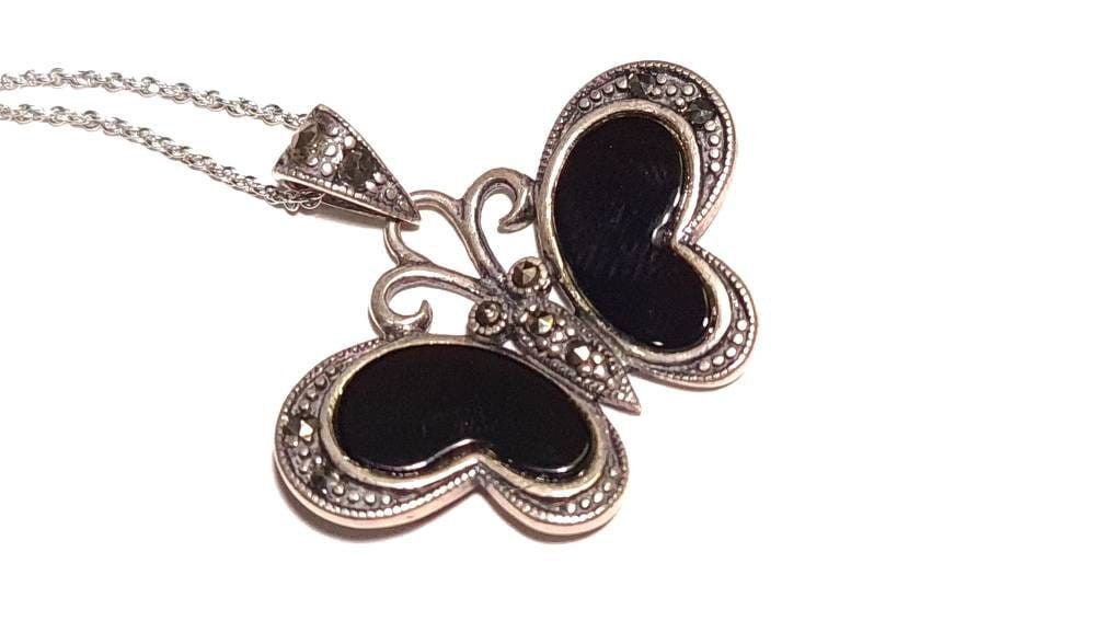 Marcasite 925 Sterling Silver Black Onyx Butterfly Pendant Necklace with Rhodium Non Tarnish Sterling Silver Chain 21x32mm Vintage, Antique