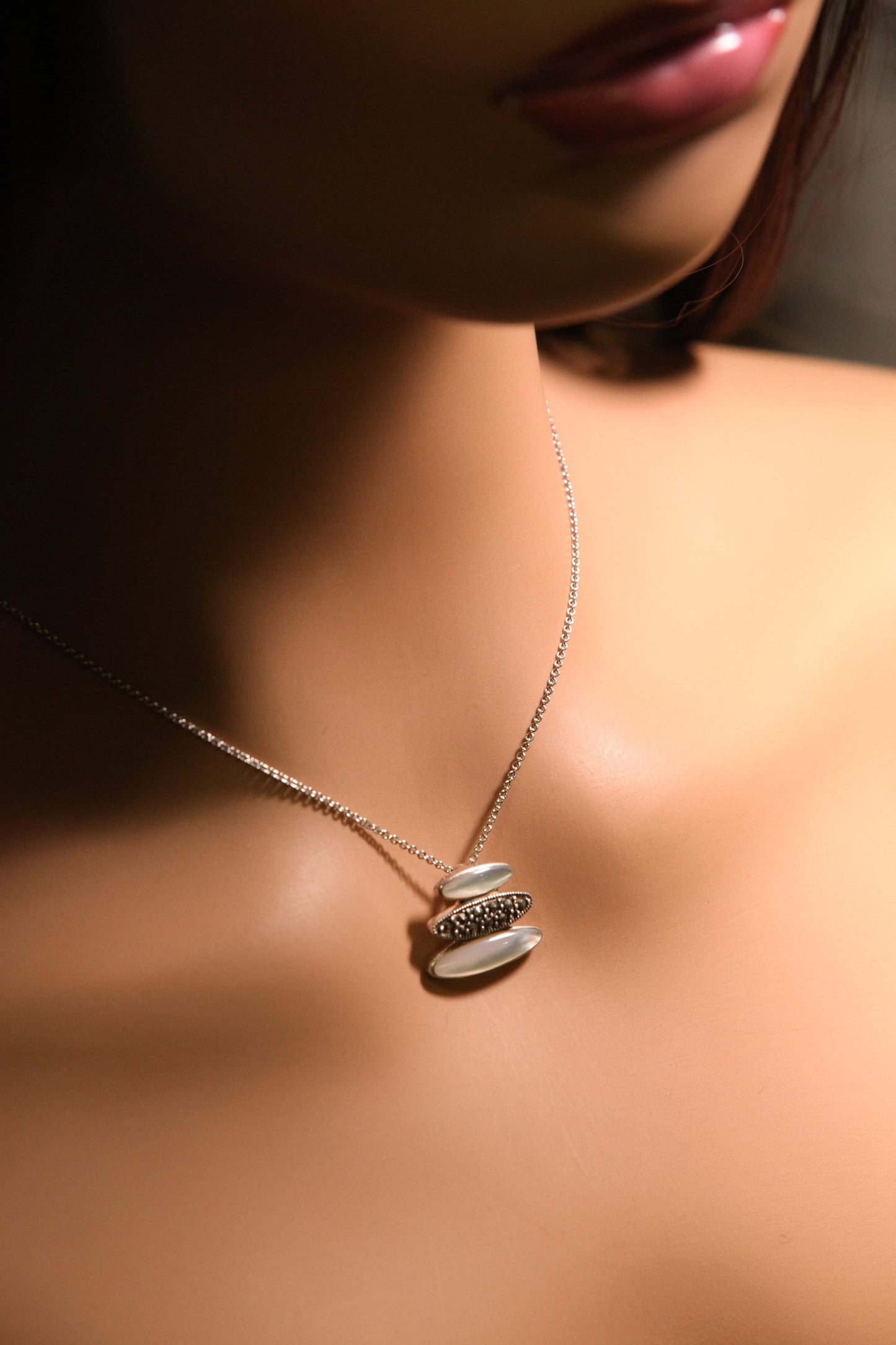 Marcasite, Natural Mother of Pearl, 925 sterling Silver Pendant. 925 Rhodium Sterling Silver Cable Chain necklace Vintage antique gift