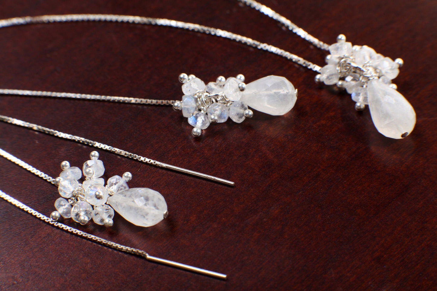 Moonstone Earrings Necklace Set, Moonstone 5" Long Threader Earrings & Pendant with Moonstone Clusters, 925 Sterling Silver Ear Wire, Chain