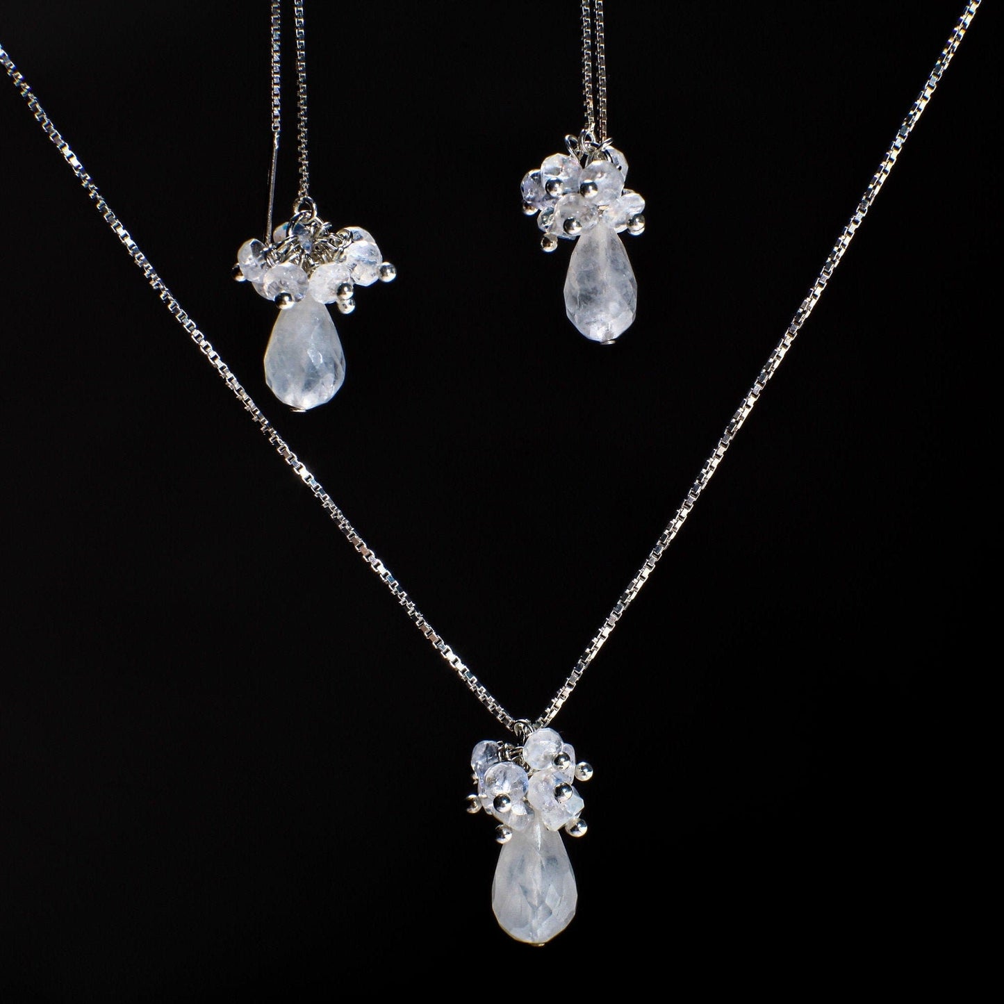 Moonstone Earrings Necklace Set, Moonstone 5" Long Threader Earrings & Pendant with Moonstone Clusters, 925 Sterling Silver Ear Wire and Sterling Silver Box Chain