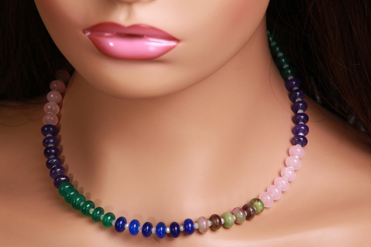 Materials: Gemstone, Amethyst, Jade, Rose Quartz, Blue jade, Ruby Zoisites, Rhodium Silver.