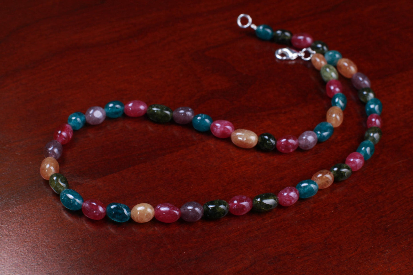 Multi color Rainbow gemstone 7-8mm smooth oval Tourmaline Quartz beaded necklace. Blue pink purple yellow necklace. Silver filled lobster clasp