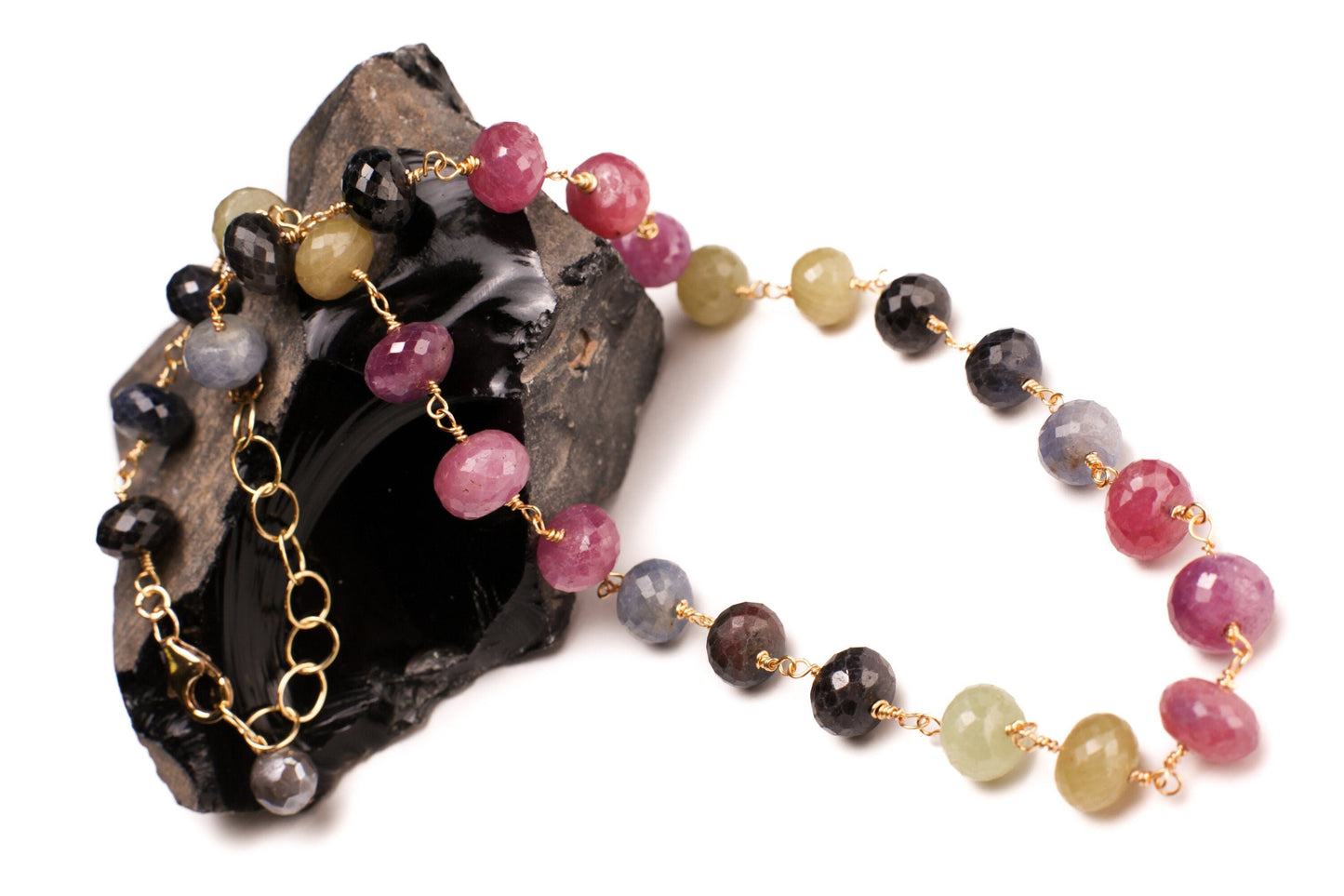 Multi Sapphire Necklace Wire Wrapped Faceted Rondelle 11mm, 14K Gold Filled Chain & Clasp Necklace with 2" Extension