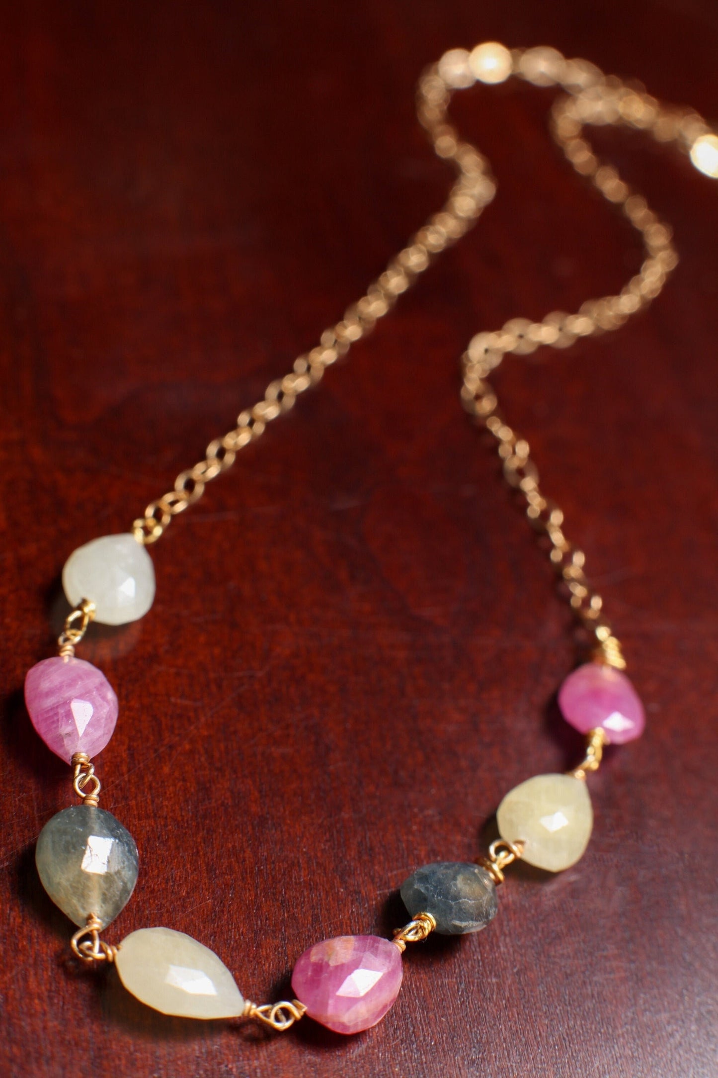 Multi Sapphire Necklace Wire Wrapped Faceted Pear Drop 7x9-10mm in 14K Gold Filled Chain & Clasp Necklace