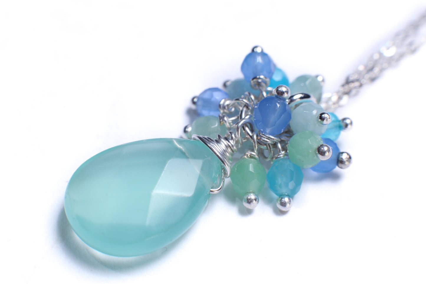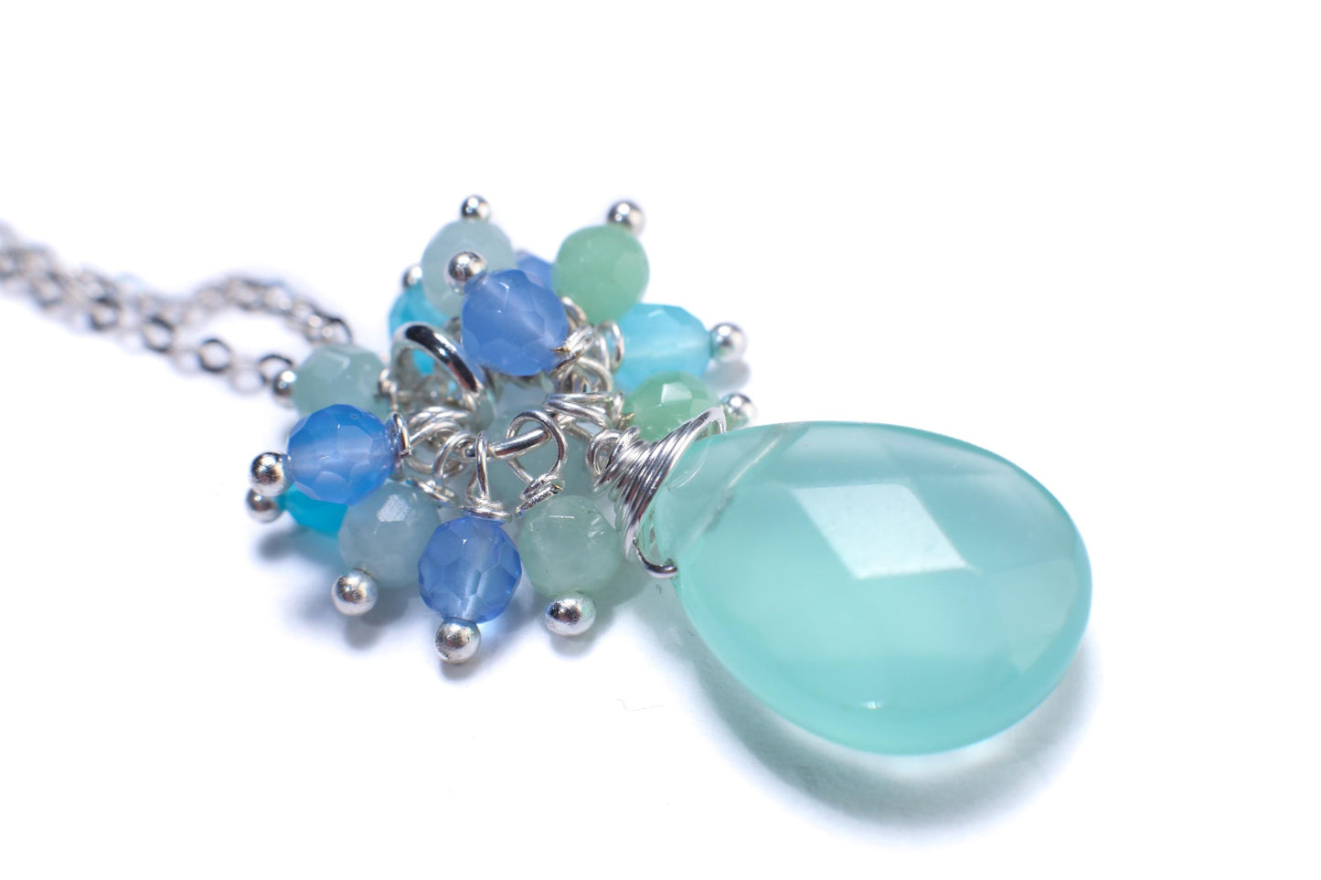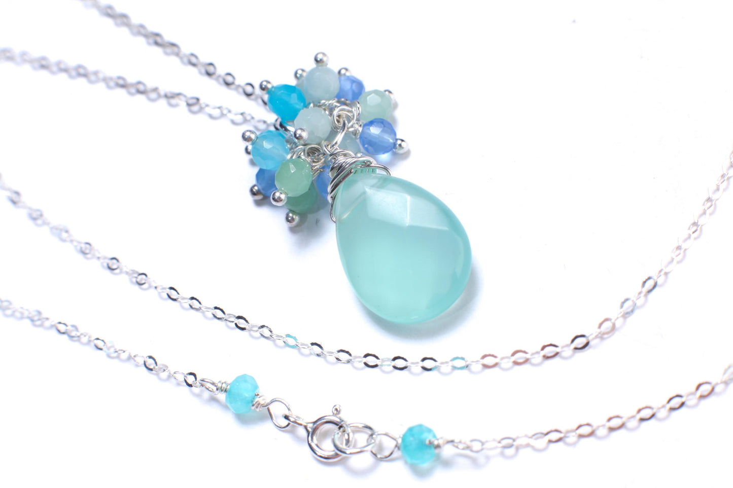 Natural Aqua Chalcedony Faceted Pear Drop 13x21mm, Wire Wrapped Faceted 4mm Sky Blue Quartz Clusters in 927 Sterling Silver Clasp and Chain