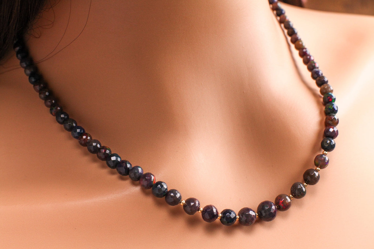 Natural Black Ethiopian Welo Fire Opal Faceted Round 3-7mm Graduated Necklace. 14K Gold Filled Necklace