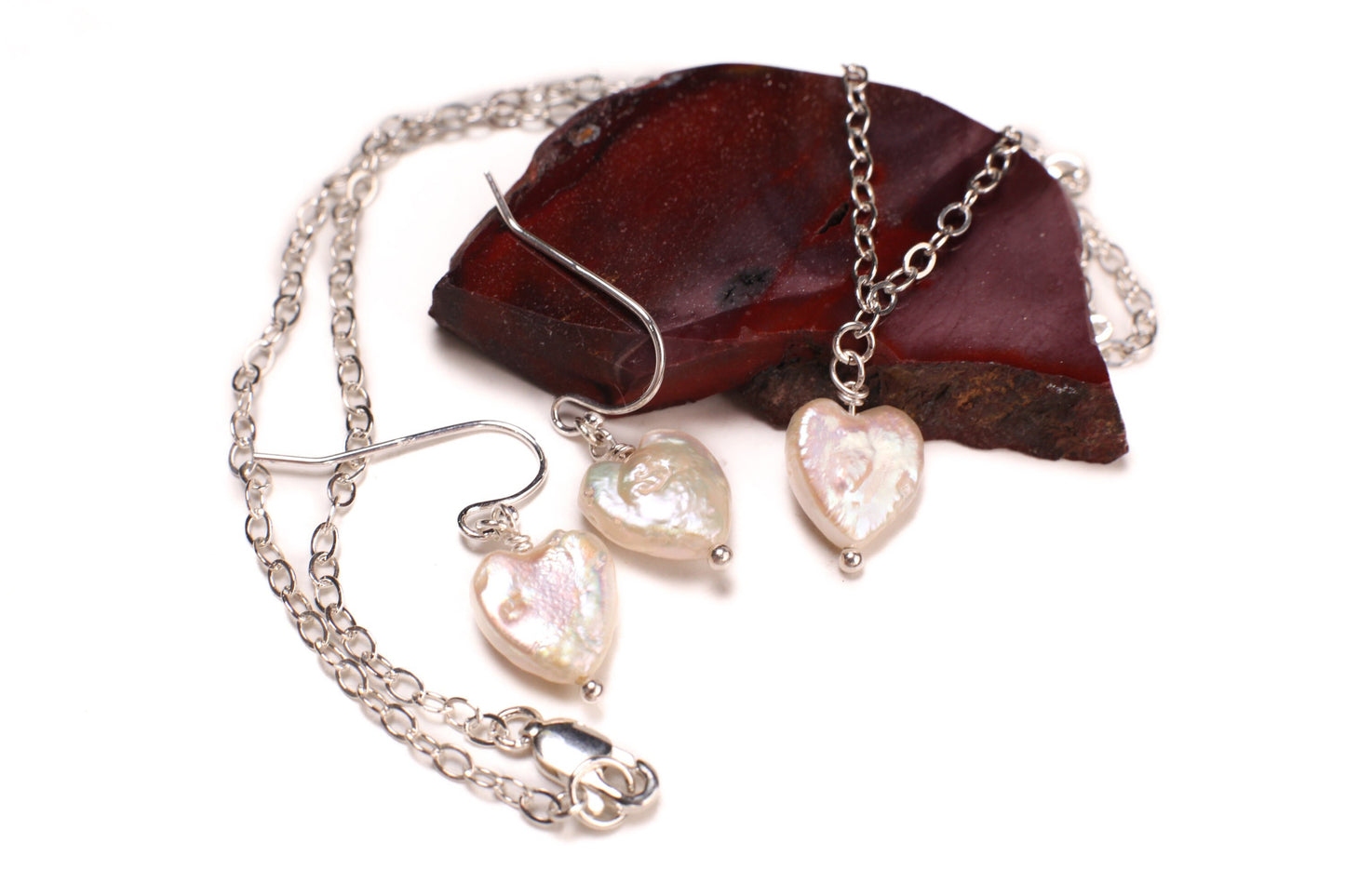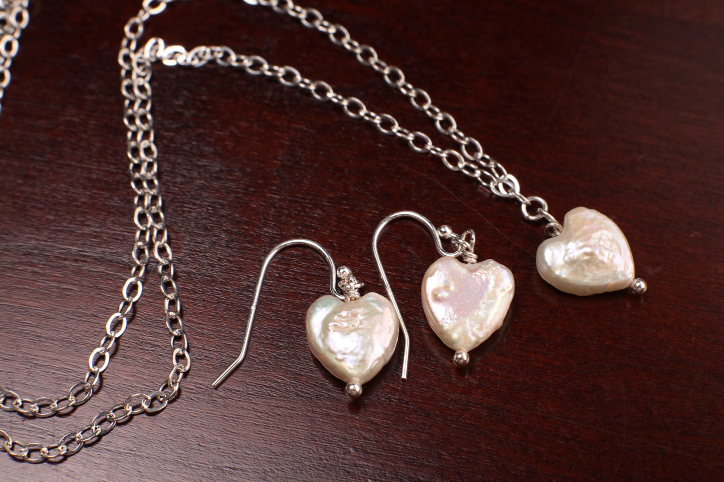 Natural Freshwater Heart shape Pearl White High Luster Pendant Necklace, Earrings Jewelry set in 925 Sterling Silver