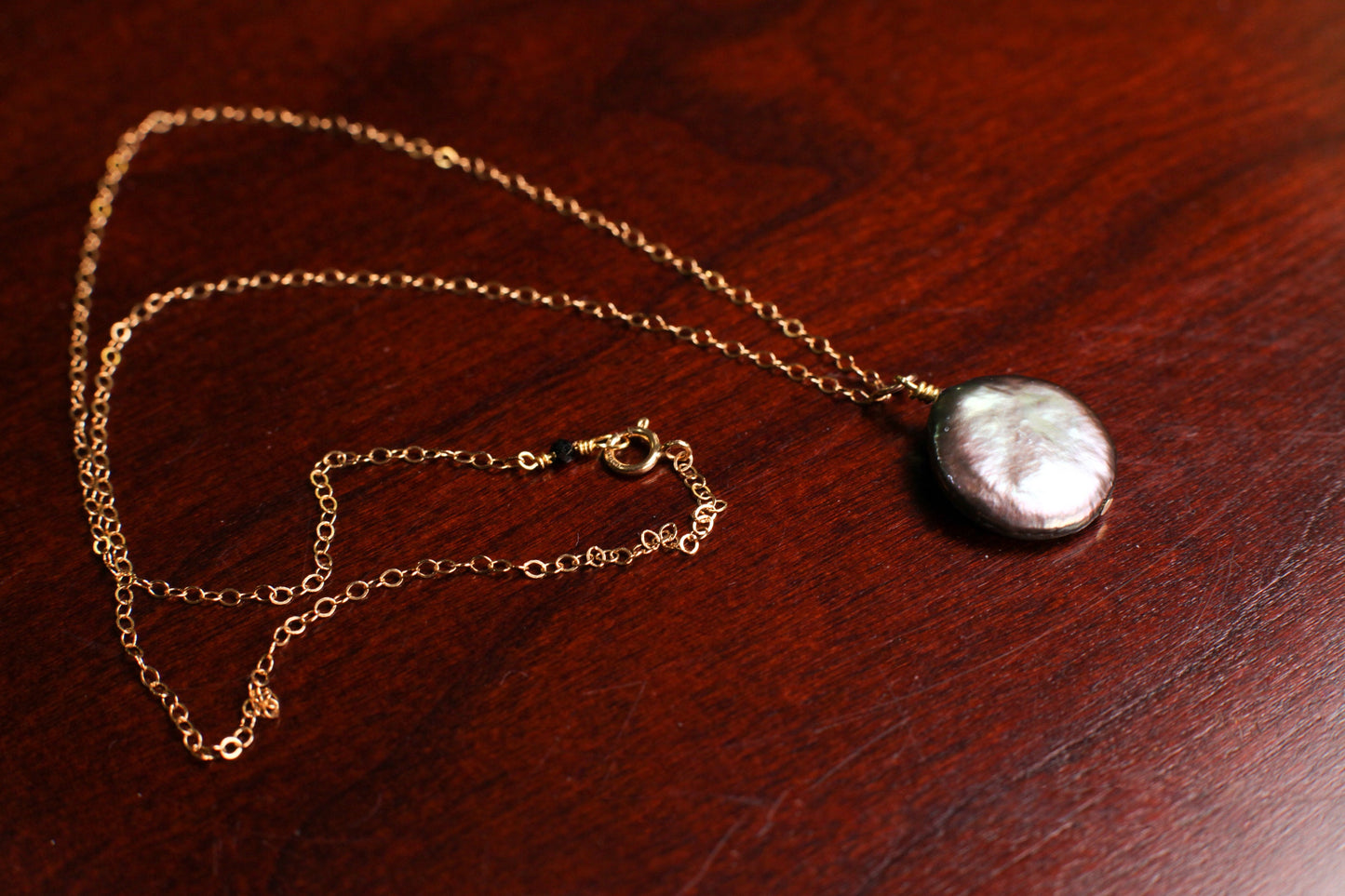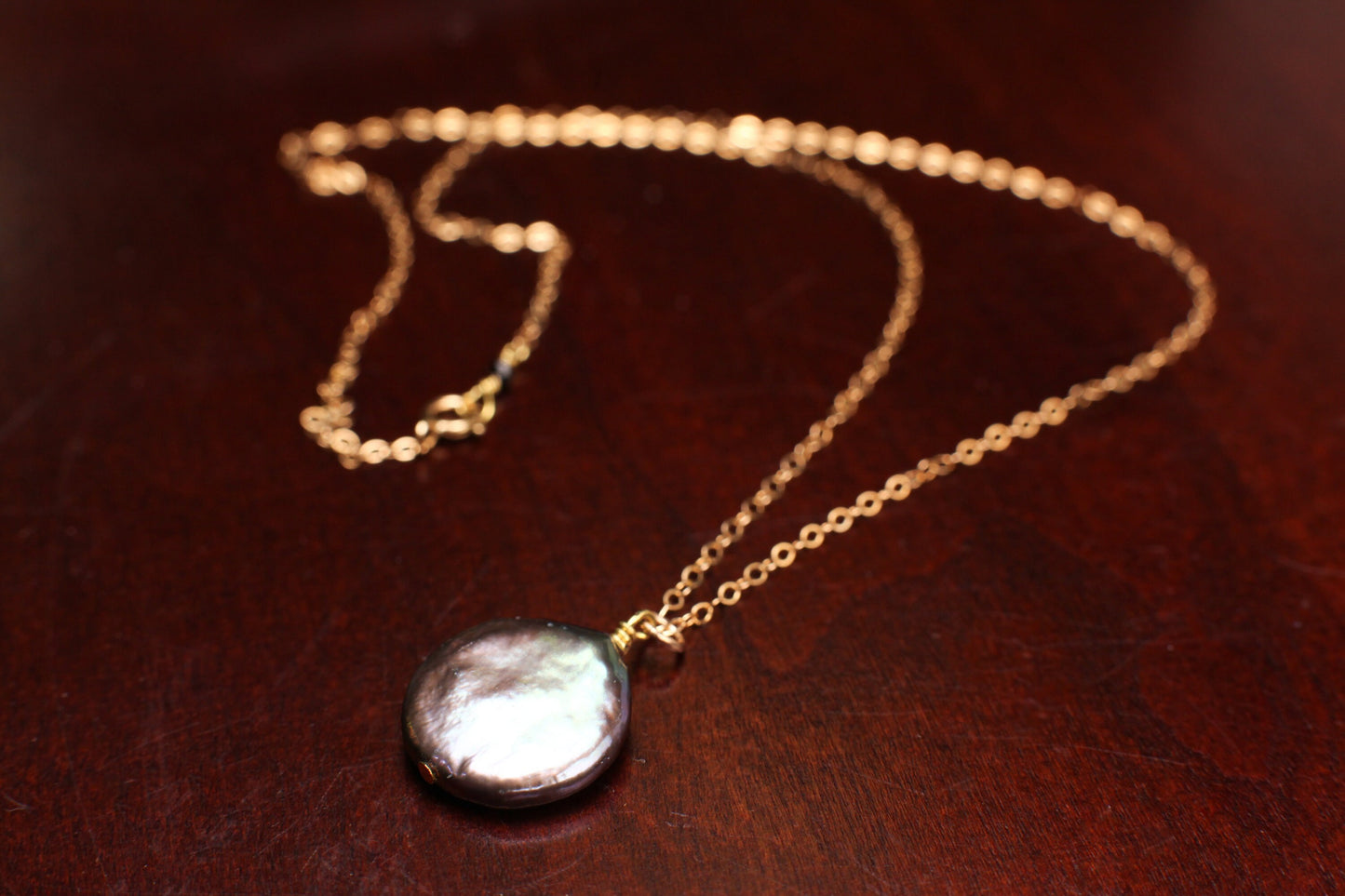 Freshwater Peacock Gray 16mm large Coin Pearl High Luster Dangling Wire Wrapped Pendant in Sterling Silver or 14k Gold Filled Necklace