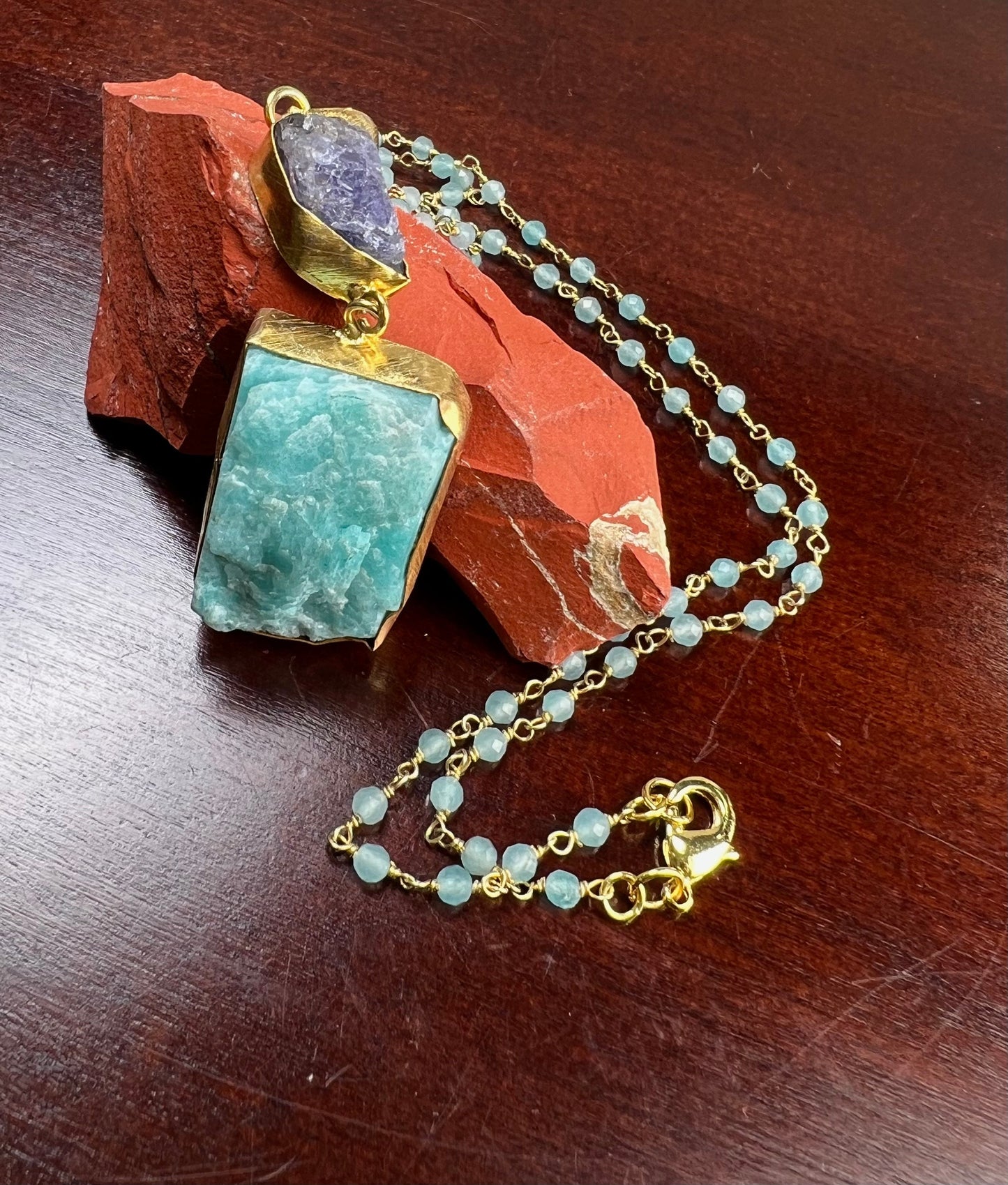 Natural Larimar Raw and Amethyst raw handmade 18k gold bezel Necklace, matching blue Apatite rosary chain . Good luck , healing chakra