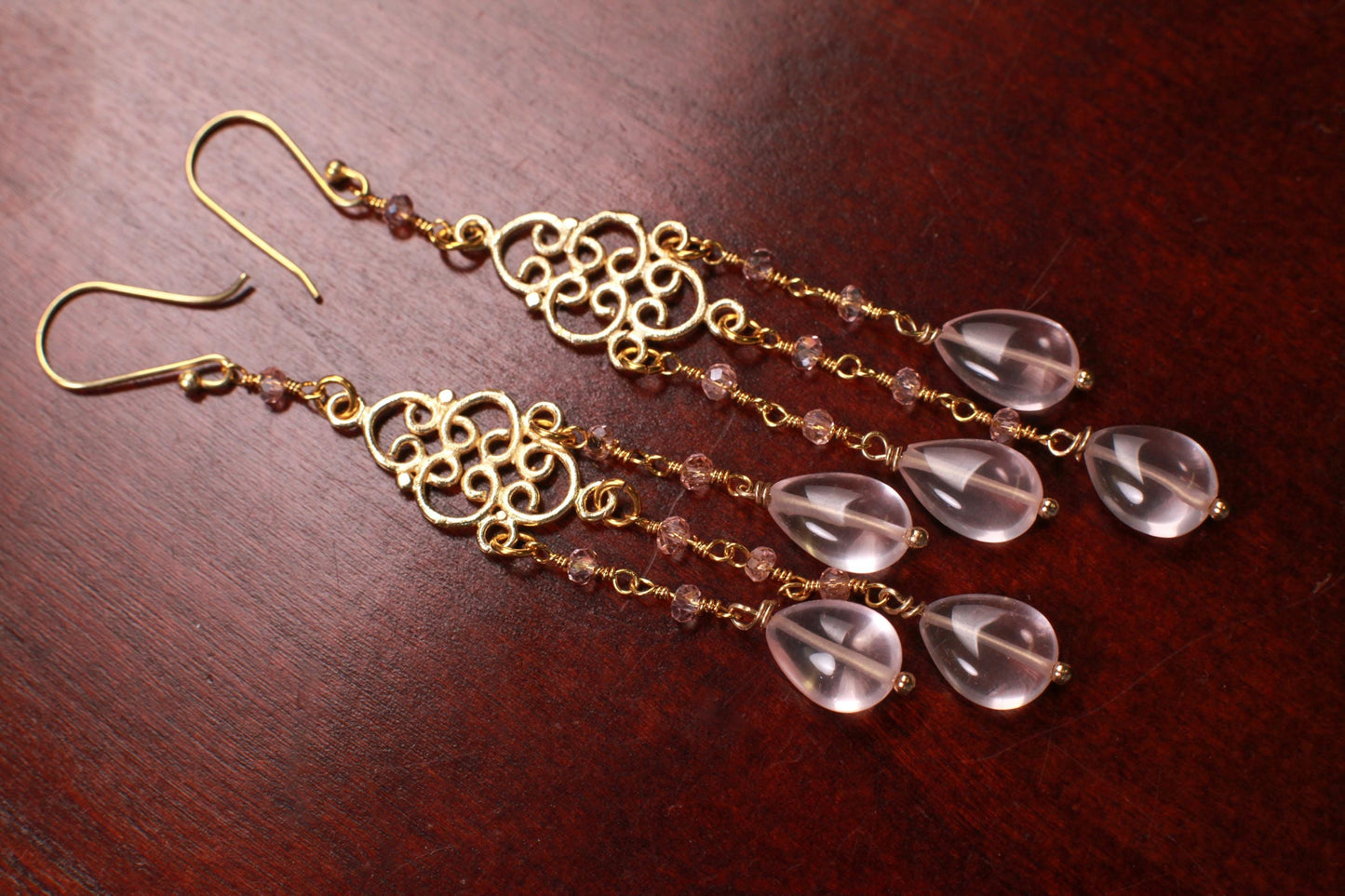 Natural Morganite Chandelier Earrings, Faceted Pink Topaz Wire wrapped Gold Vermeil earwire, Gold Over Sterling Silver Earrings