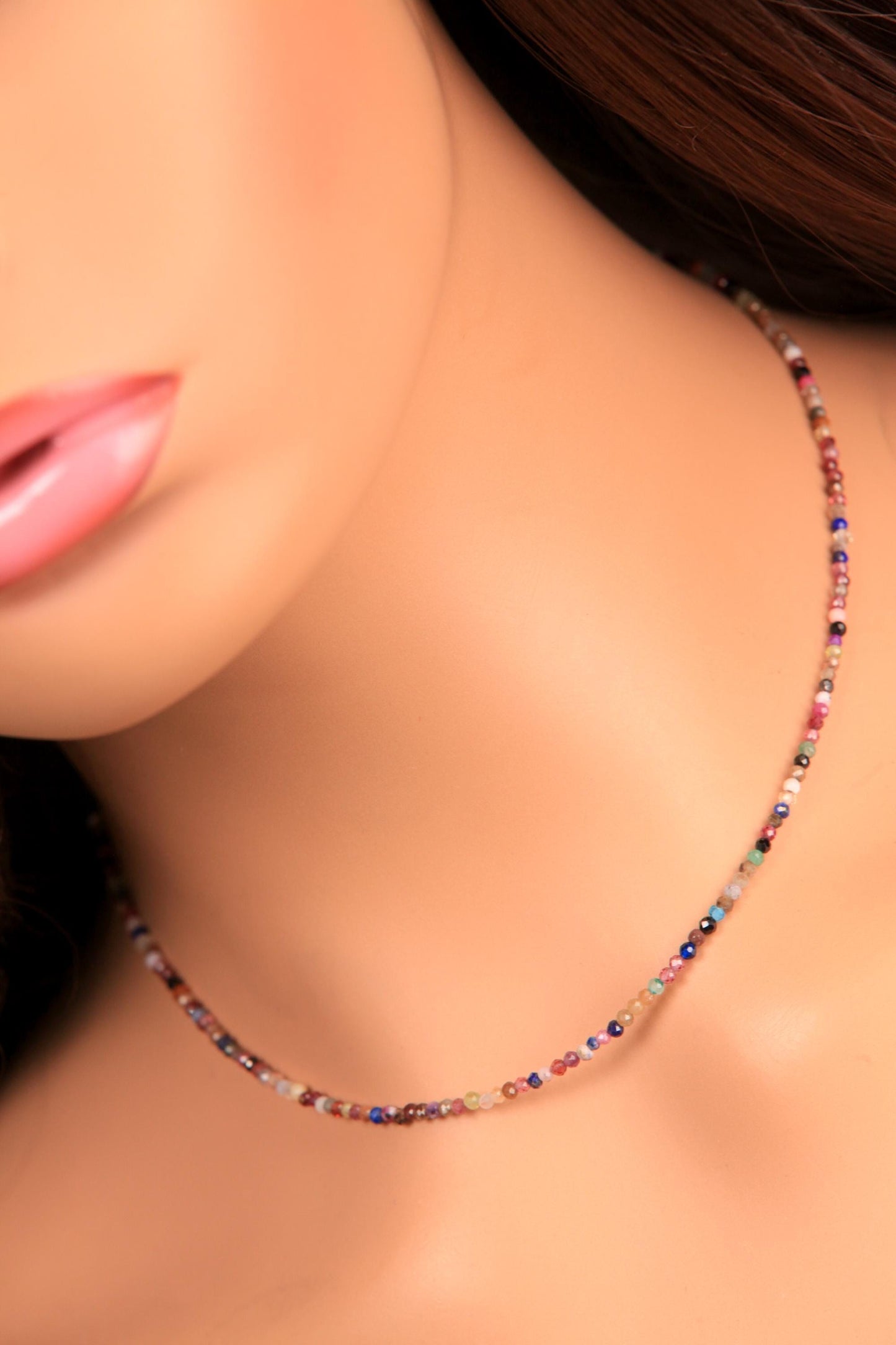 Natural Multi Gemstone 2mm Faceted Round with Sterling Silver Clasp Dainty Choker Layering Elegant Necklace