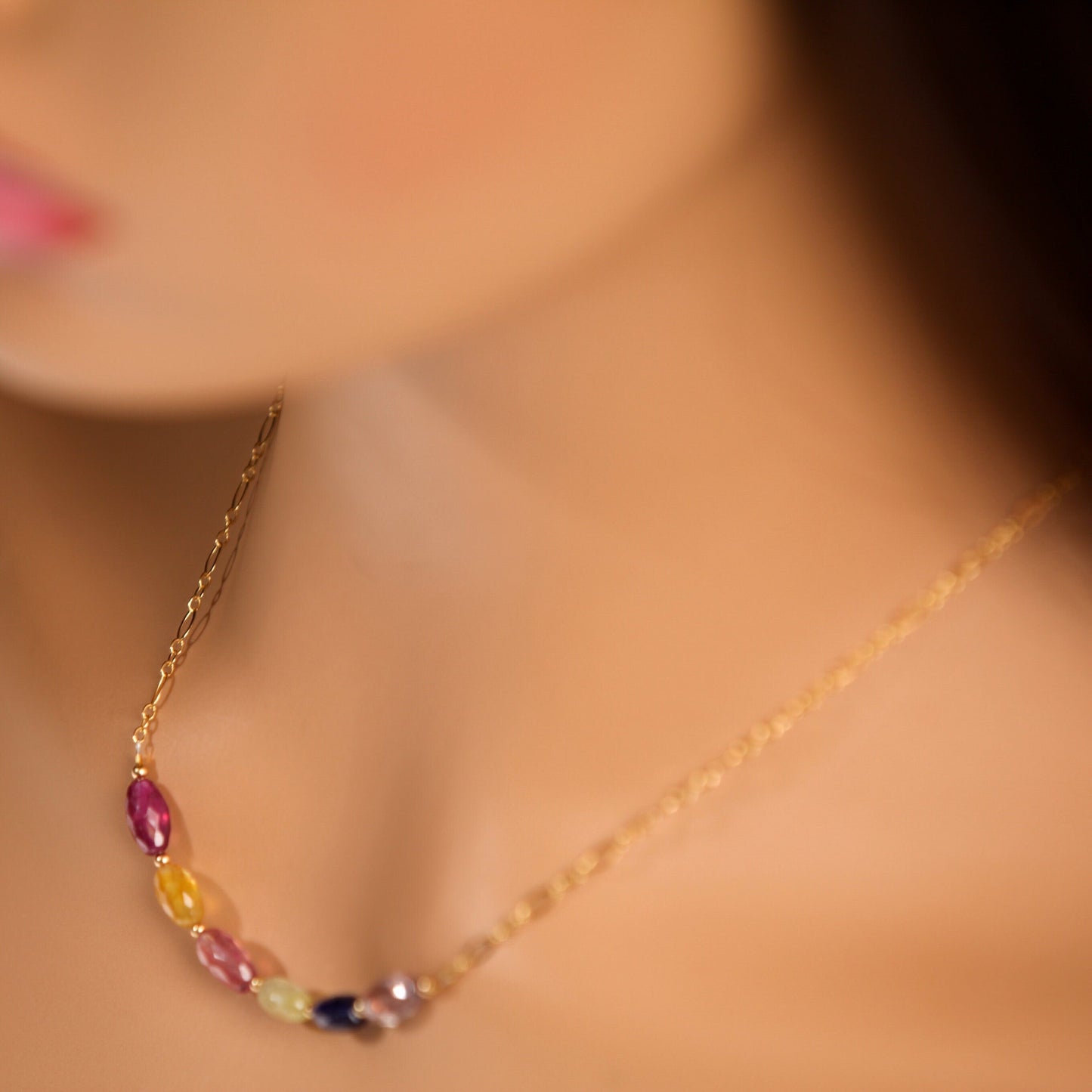 Genuine Multi Sapphire Faceted Oval 5x8-9mm Gemstone Bar Necklace with 14K Gold Filled Spacers, Clasps and Chain, Elegant Gift for her