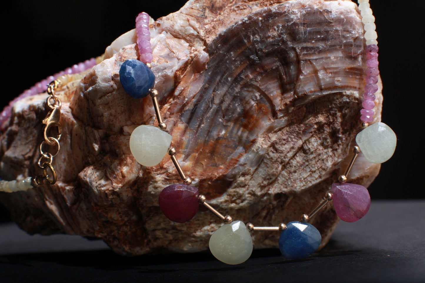 Natural Multi Sapphire heart Teardrop with 4mm Multi Sapphire roundel , 14K Liquid Gold Filled Tube, Spacer & Clasp 16"- 30"Necklace