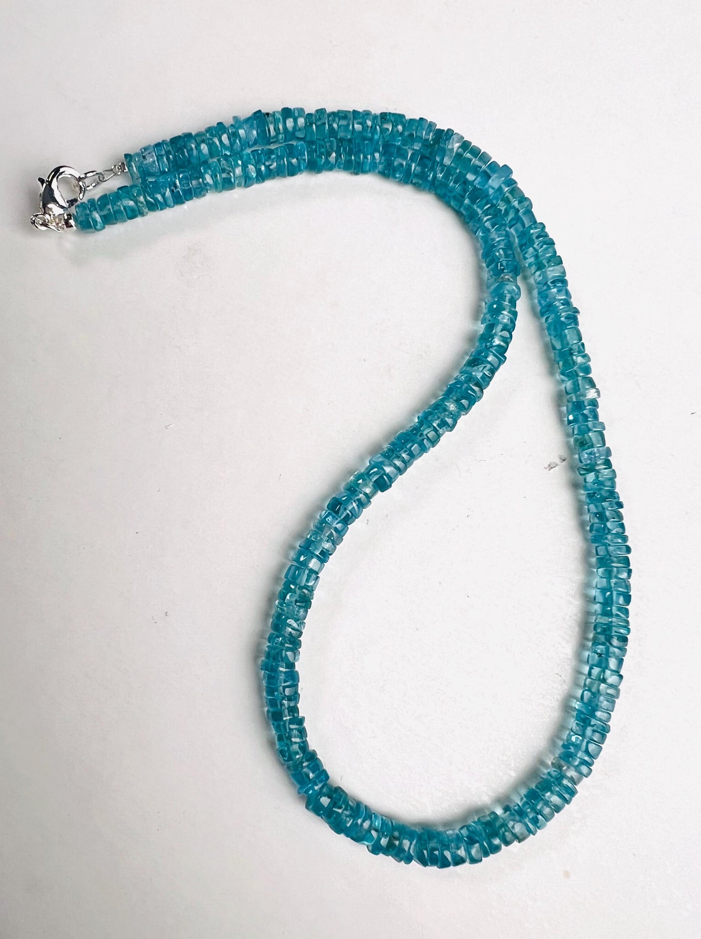 Natural Neon Blue Apatite 5mm-5.mm Smooth heishi roundel gemstone bead sterling silver necklace beautiful aqua neon blue beaded choker or layer necklace